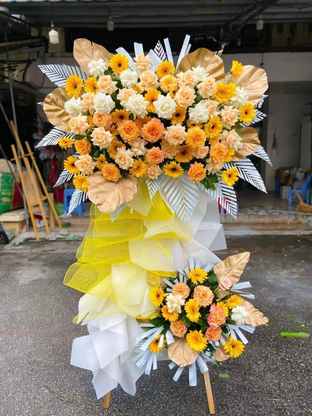 Hoa vàng như hướng dương, đồng tiền, hồng vàng hoặc lan được bố trí theo tầng lớp rõ ràng, giúp tổng thể hài hòa và sang trọng. Đây là kiểu thiết kế thể hiện sự trang trọng và lời chúc phát triển mạnh mẽ.